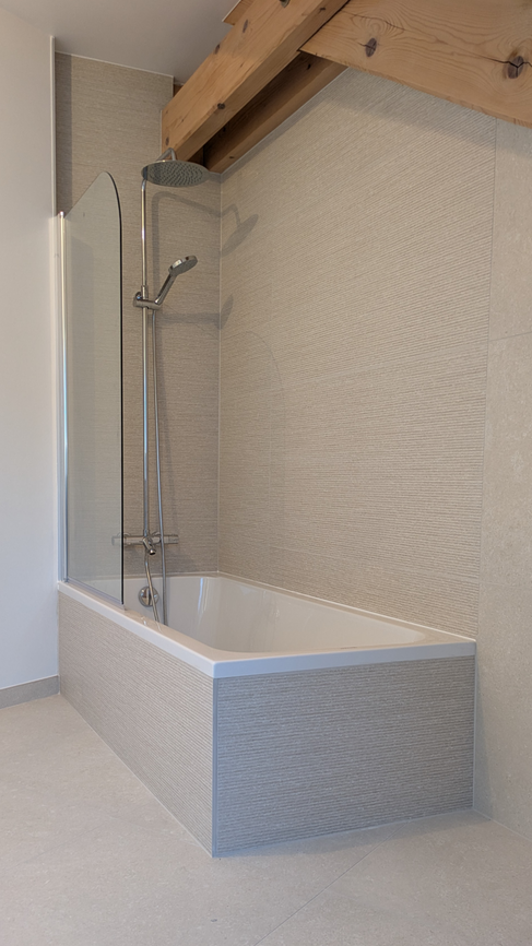 La configuration sous rampant, ainsi que la présence apparente des éléments de charpente, ont nécessité une attention particulière lors de la pose du carrelage, notamment pour les découpes et les finitions !